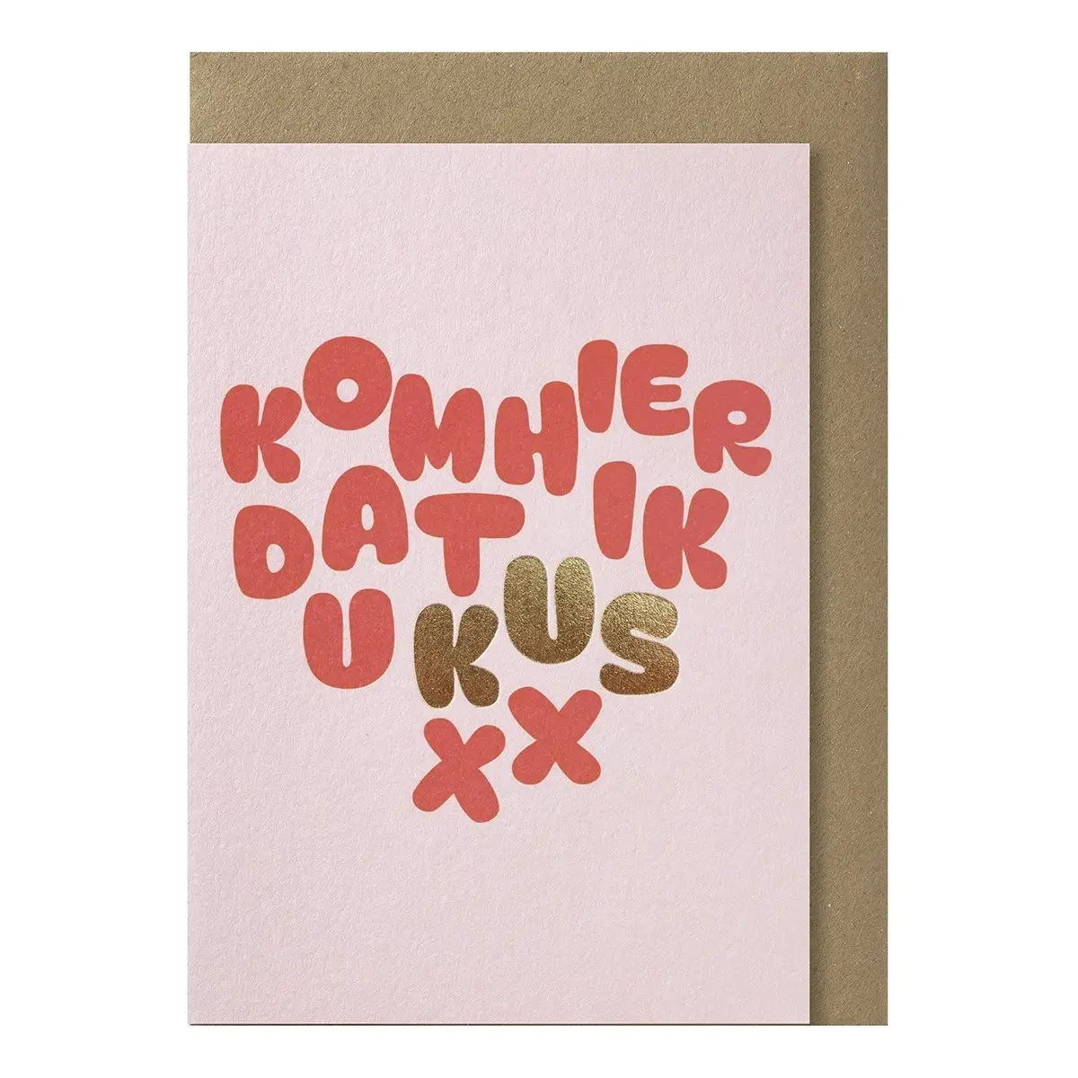 Alle letters vormen samen een hart van liefde, en in het midden staat het onmiskenbare: “Kom hier dat ik u kus xx”. De speelse typografie en warme kleuren (met glanzende goudfolie op het woord ‘kus’) zorgen voor een vrolijk, verliefd en tegelijk ondeugend geheel. Perfect voor een romantisch gebaar, een lieve verrassing of gewoon omdat je iemand supergraag ziet.