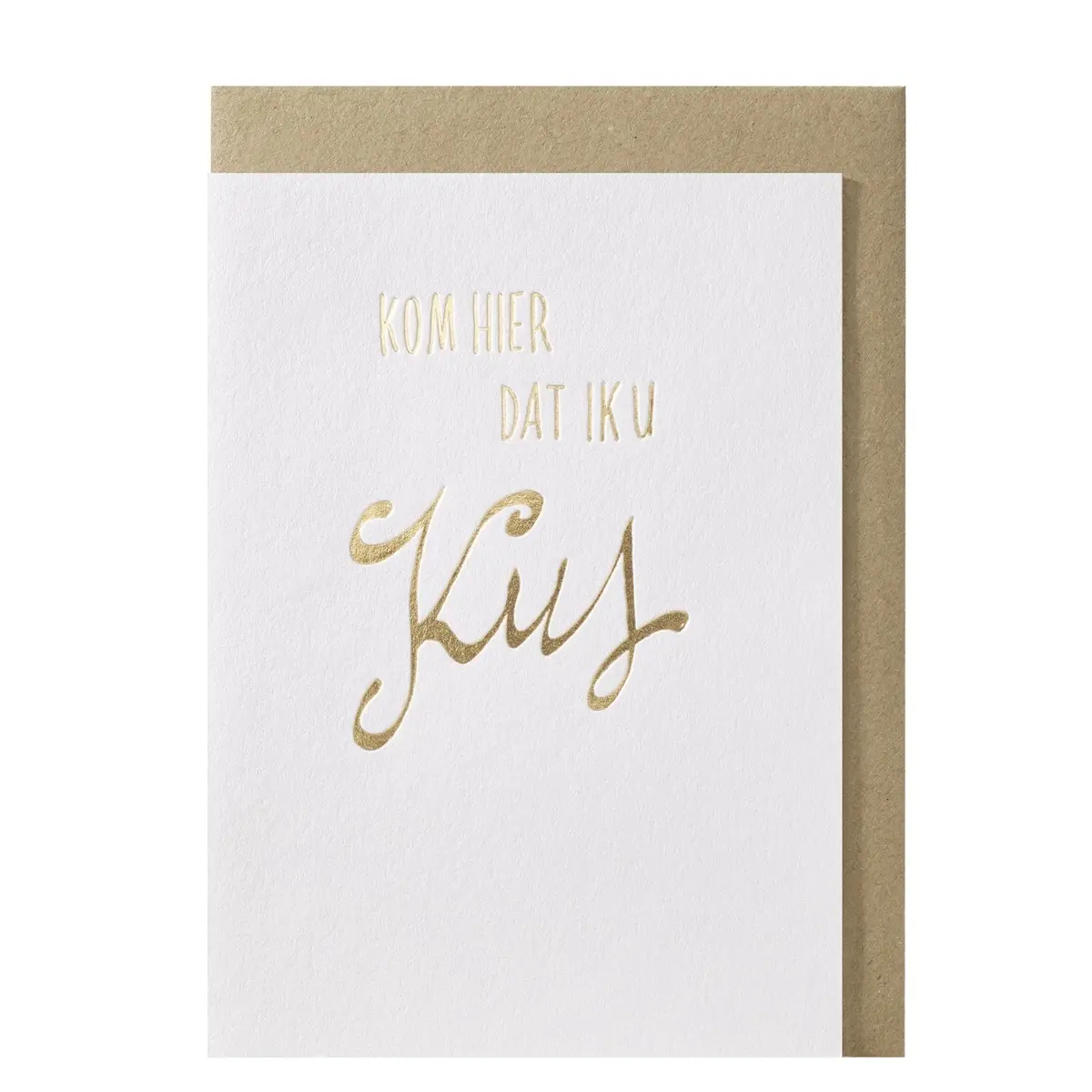 Met een knipoog én elegantie staat op deze kaart in glanzende goudfolie: “Kom hier dat ik u kus.” De speelse typografie en stijlvolle afwerking maken het een perfecte kaart voor Valentijn, een jubileum of gewoon zomaar – omdat je iemand graag ziet.