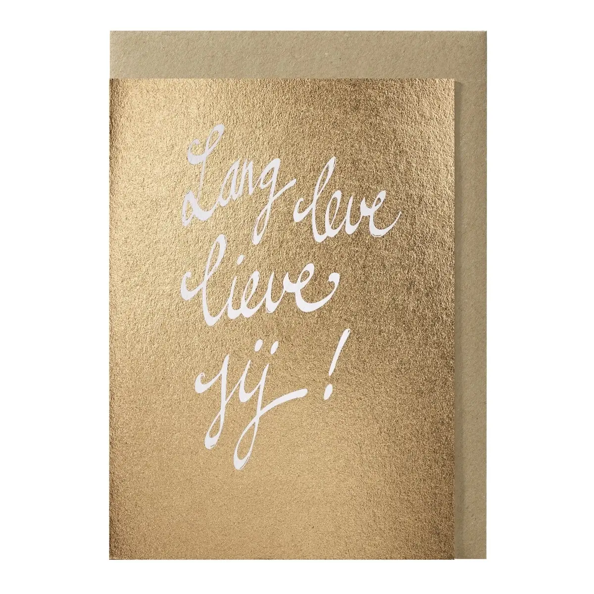 Deze sprankelende kaart schittert in goudfolie van rand tot rand, met speelse witte handgeschreven letters die uitroepen: “Lang leve lieve jij!” Een feestelijke én hartverwarmende boodschap voor wie je lief is – op een verjaardag, jubileum of zomaar.