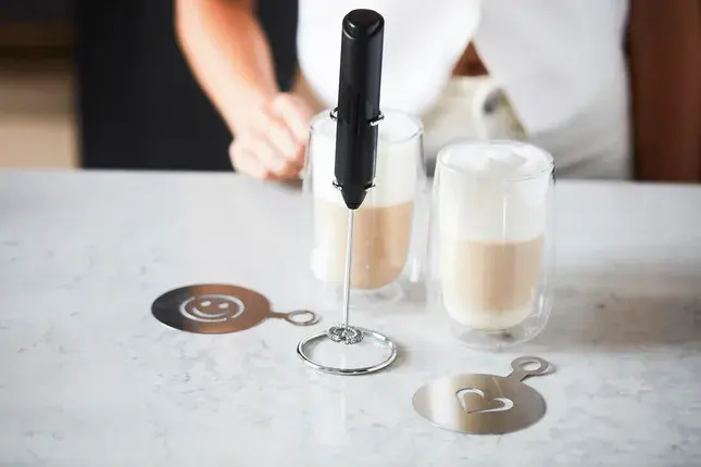 Met de meegeleverde elektrische melkopschuimer tover je in enkele seconden romig melkschuim tevoorschijn. En dankzij de roestvrijstalen stencils voeg je een creatieve touch toe aan je drank met cacao, kaneel of poedersuiker.