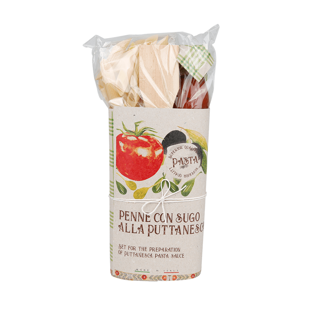 Authentieke Italiaanse pastakit voor Penne alla Puttanesca, compleet met penne en een rijke, hartige Puttanesca saus. Ideaal voor liefhebbers van intense smaken! Een ideaal cadeau voor pasta-lovers!