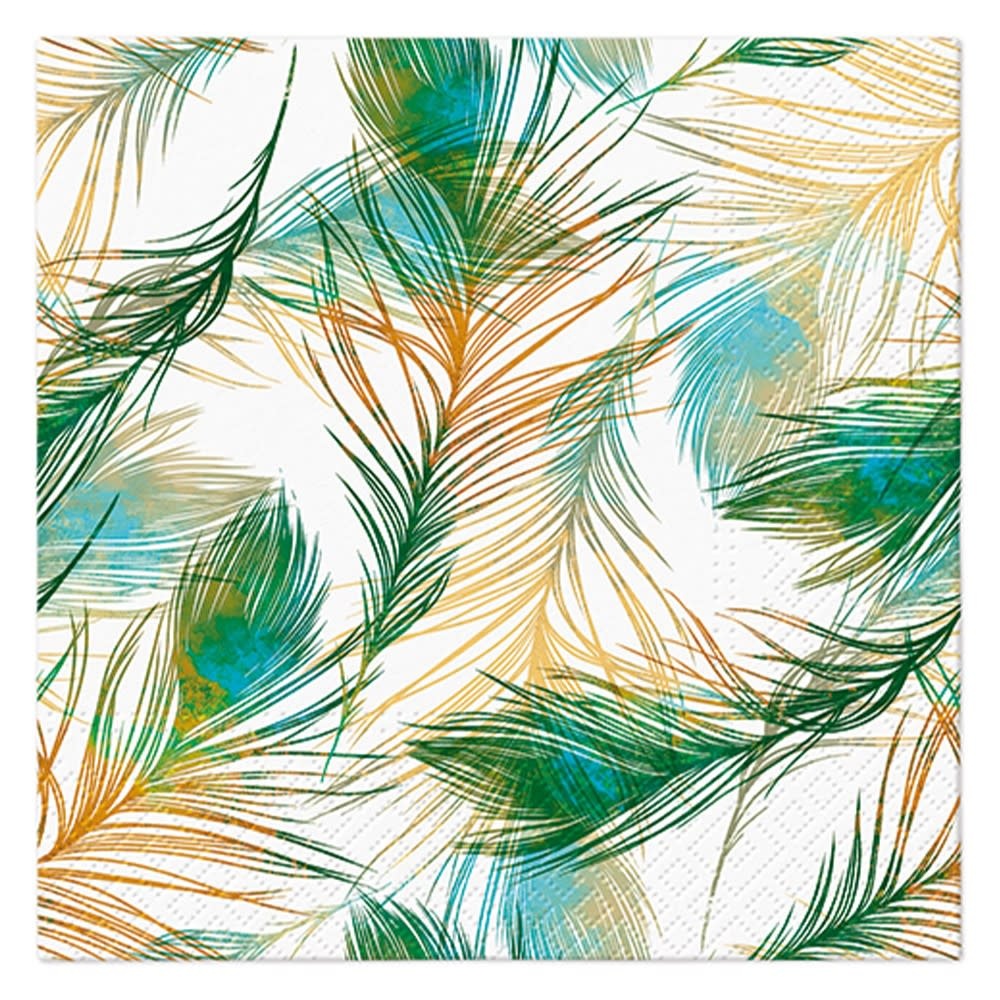 De PAW servietten Feather Composition combineren verfijnd design met praktische luxe. Het motief toont een harmonieus spel van pauwenveren in zachte groen-, turquoise- en goudtinten, wat een luchtige en tegelijkertijd chique sfeer creëert op jouw tafel.