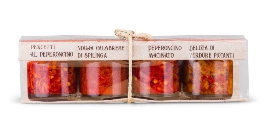 Set van vier artisanale Calabrische chilirecepten. Heerlijk pikant om te gebruiken op een bruschetta.