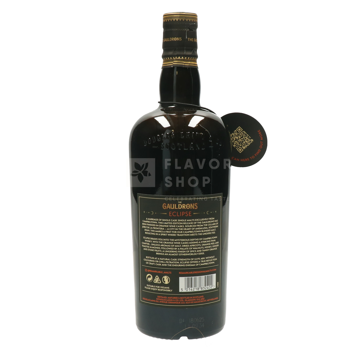 De naam "Gauldrons" verwijst naar de donkere, stormachtige baaien langs de westkust van Campbeltown. "Eclipse" (zonsverduistering) benadrukt het mystieke en diepe karakter van deze botteling. De rijping op orange wine casks zorgt voor een gelaagde smaakbeleving en een verleidelijke mix van fruit, kruidigheid en diepte.