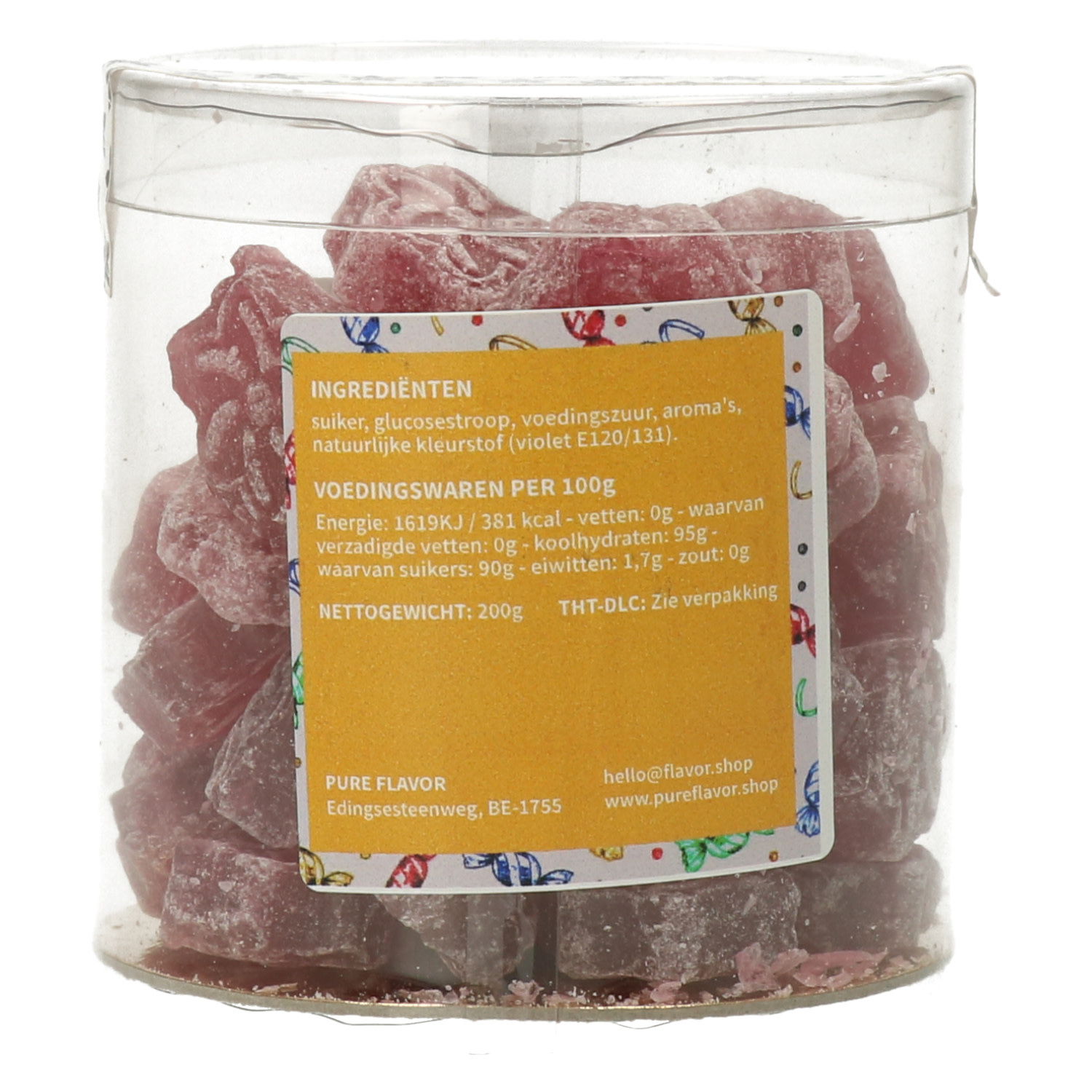 Ingrediënten: suiker, glucosestroop, voedingszuur, aroma's, natuurlijke kleurstof (violet E120/131).